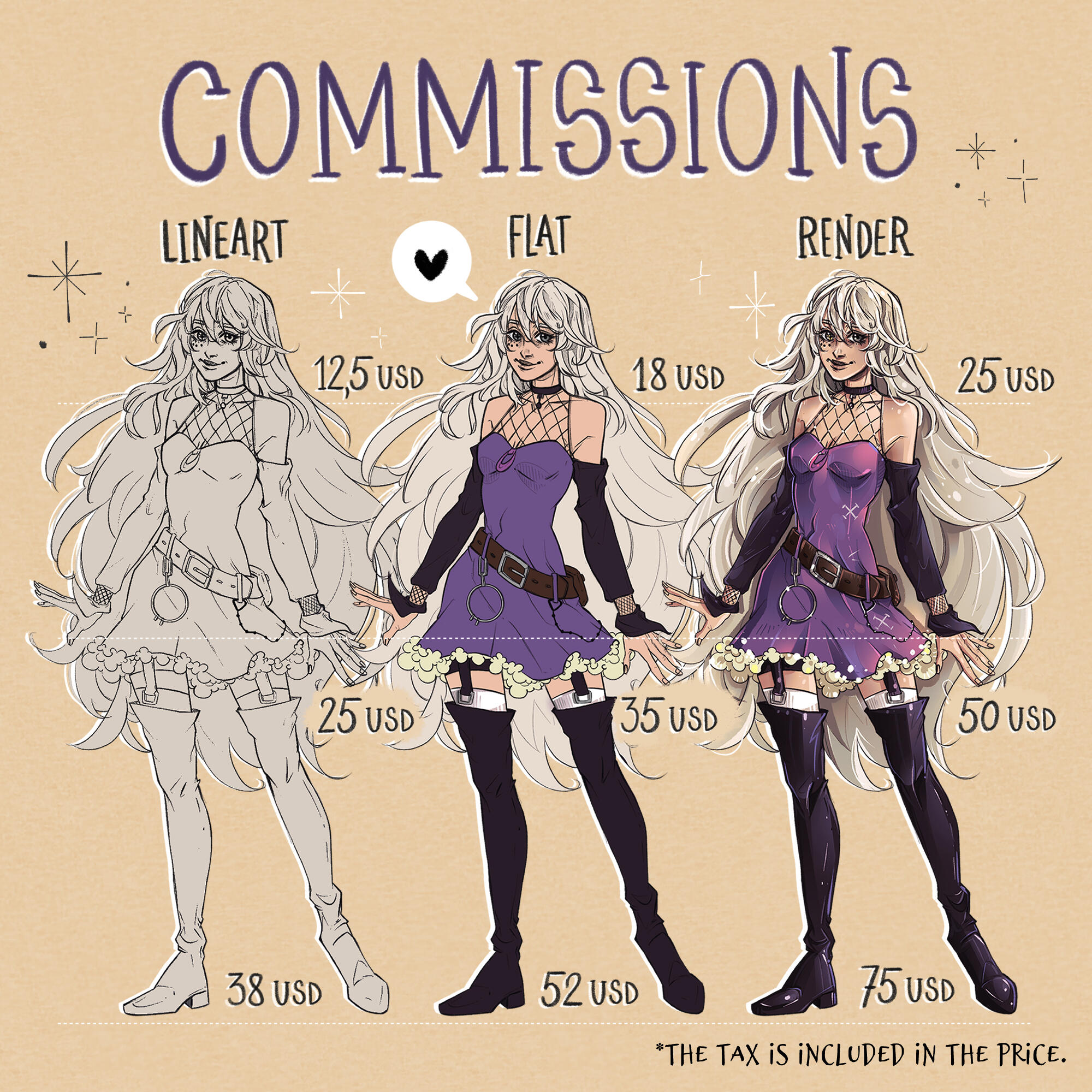2. You can find commission prices in the "Commissions" tab. Payment is required after we approve the final sketch. In specific cases, we can arrange a 50% upfront payment.